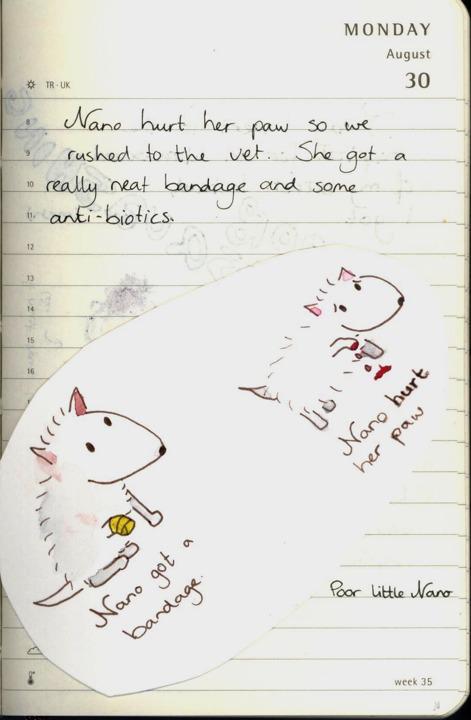 2010.08.30 Date 2010-08-30 19:07 Tags bandage / blood / hurt / paw Comments Nano hurt her paw so we rushed to the vet. She got a really neat bandage and some anti-biotics.