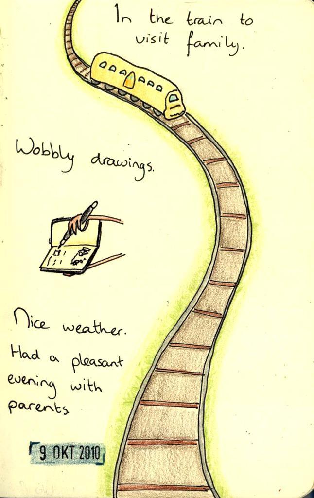 2010.10.09 Date 2010-10-09 22:30 Tags train / trip / wobbly Comments In the train to visit family. Wobbly drawings. Nice weather. Had a pleasant evening with parents.