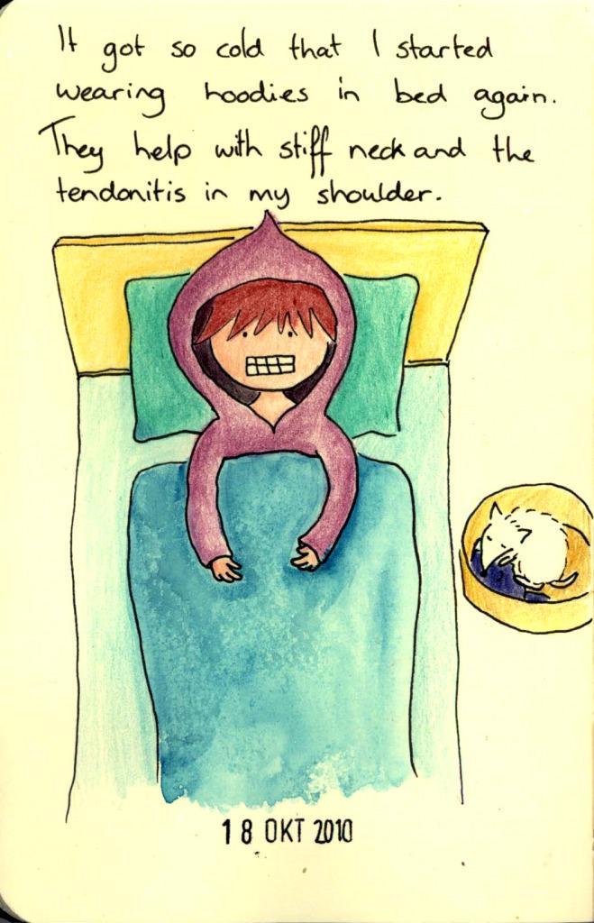 2010.10.18 Date 2010-10-18 19:56 Tags bed / cold / hoodie Comments It got so cold that I started wearing hoodies in bed again. They help with stiff neck and the tendonitis in my shoulder.