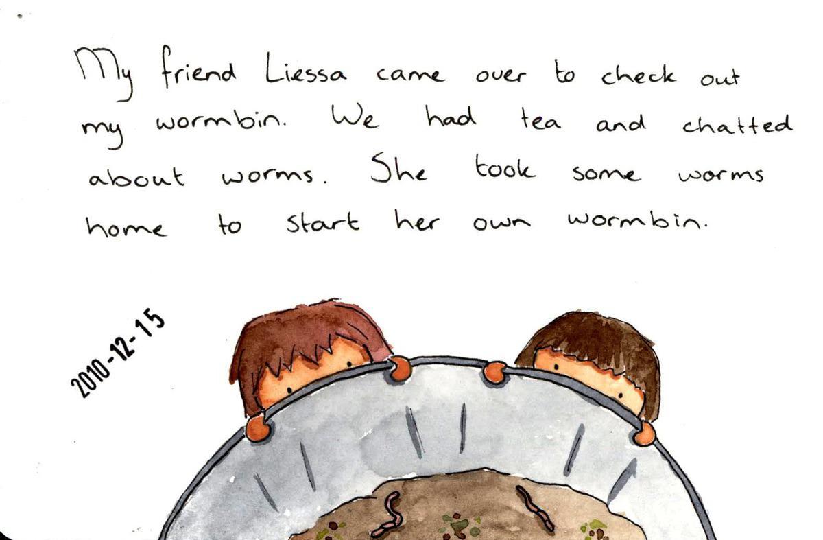 My friend Liessa came over to check out my wormbin. We had tea and chatted about worms. She took some worms home to start her own wormbin.