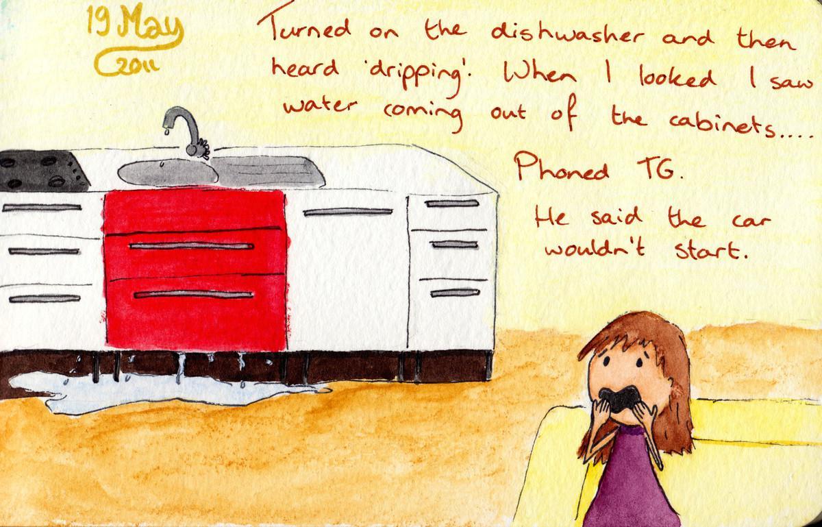Turned on the dishwasher and then heard ‘dripping’. When I looked I saw water coming out of the cabinets…