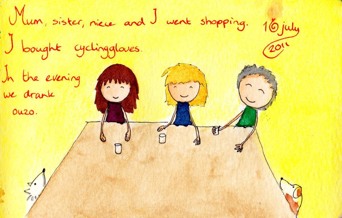 2011.07.16 Date 2011-07-16 11:45 Tags mum / niece / spike / table / yellow Comments Mum, sister, niece and I went shopping. I bought cyclinggloves. In the evening we drank ouzo.