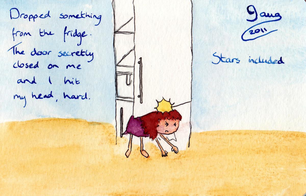 2011.08.09 Date 2011-08-09 14:06 Tags bumped / fridge / head / stars Comments Dropped something from the fridge. The door secretly closed on me and I hit my head, hard. Stars included.