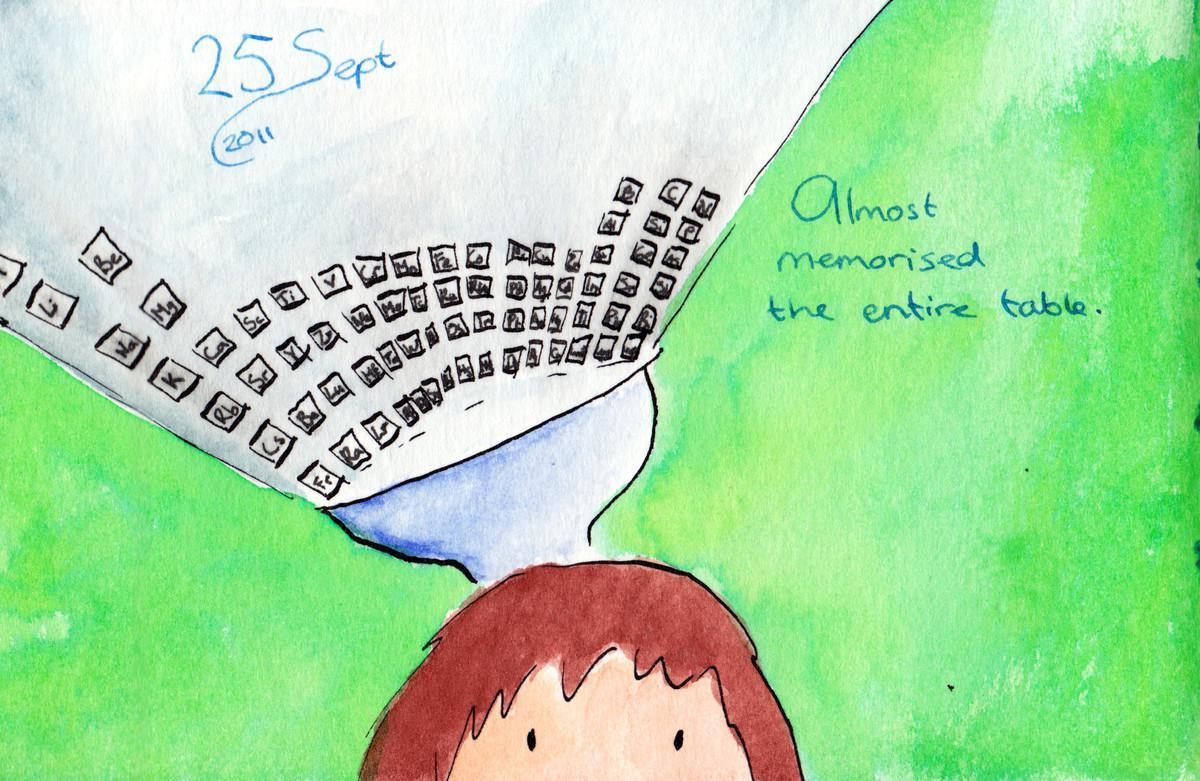 2011.09.25 Date 2011-09-25 13:03 Tags elements / memorise / periodic table Comments Almost memorised the entire table.