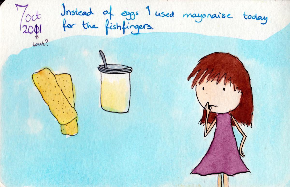 2011.10.07 Date 2011-10-07 14:39 Tags fish fingers / food / made from scratch / make your own Comments )](/books/ibc007/20111007.jpg Instead of eggs I used mayonaise today for the fishfingers.
