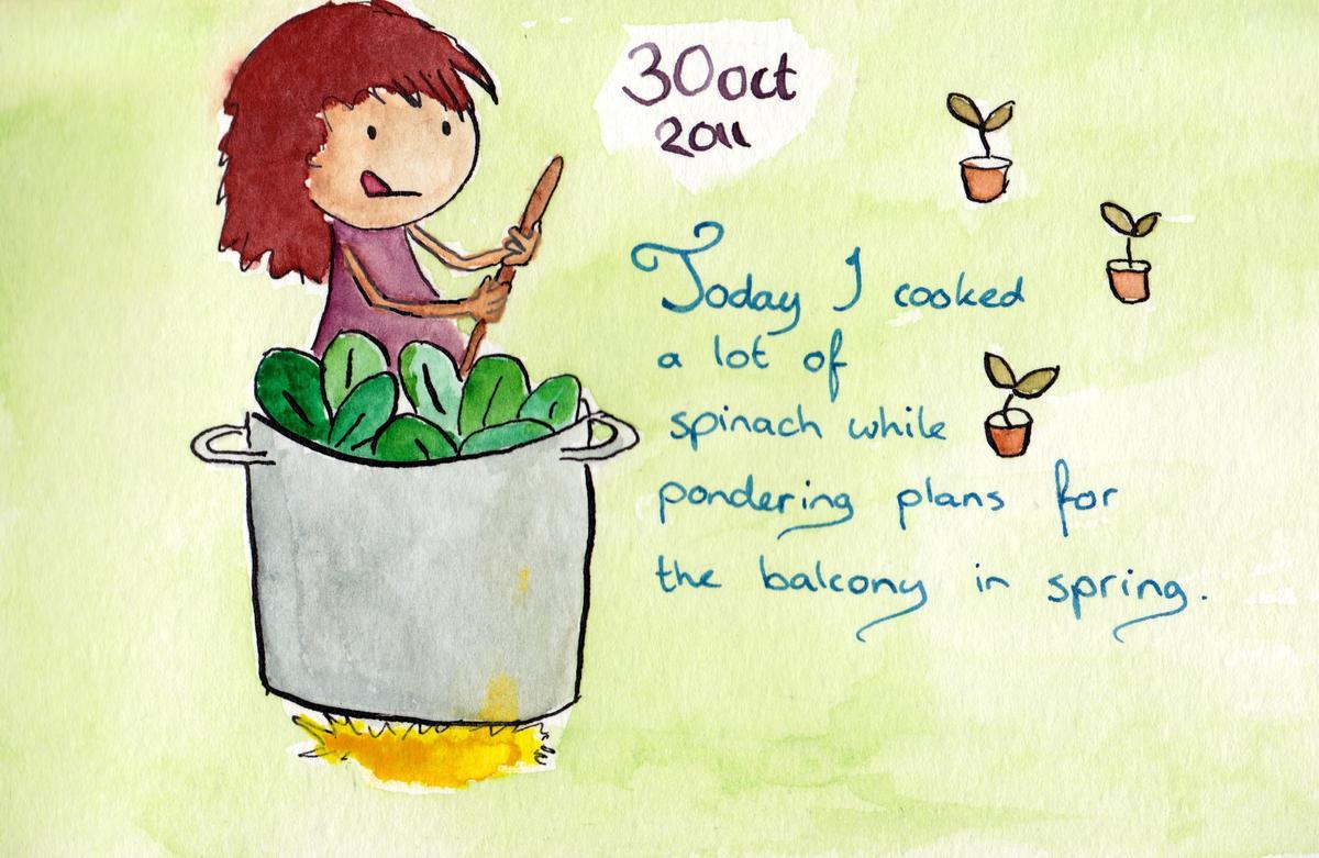 2011.10.30 Date 2011-10-30 17:13 Tags cooking / plants / spinach Comments Today I cooked a lot of spinach while pondering plans for the balcony in spring.