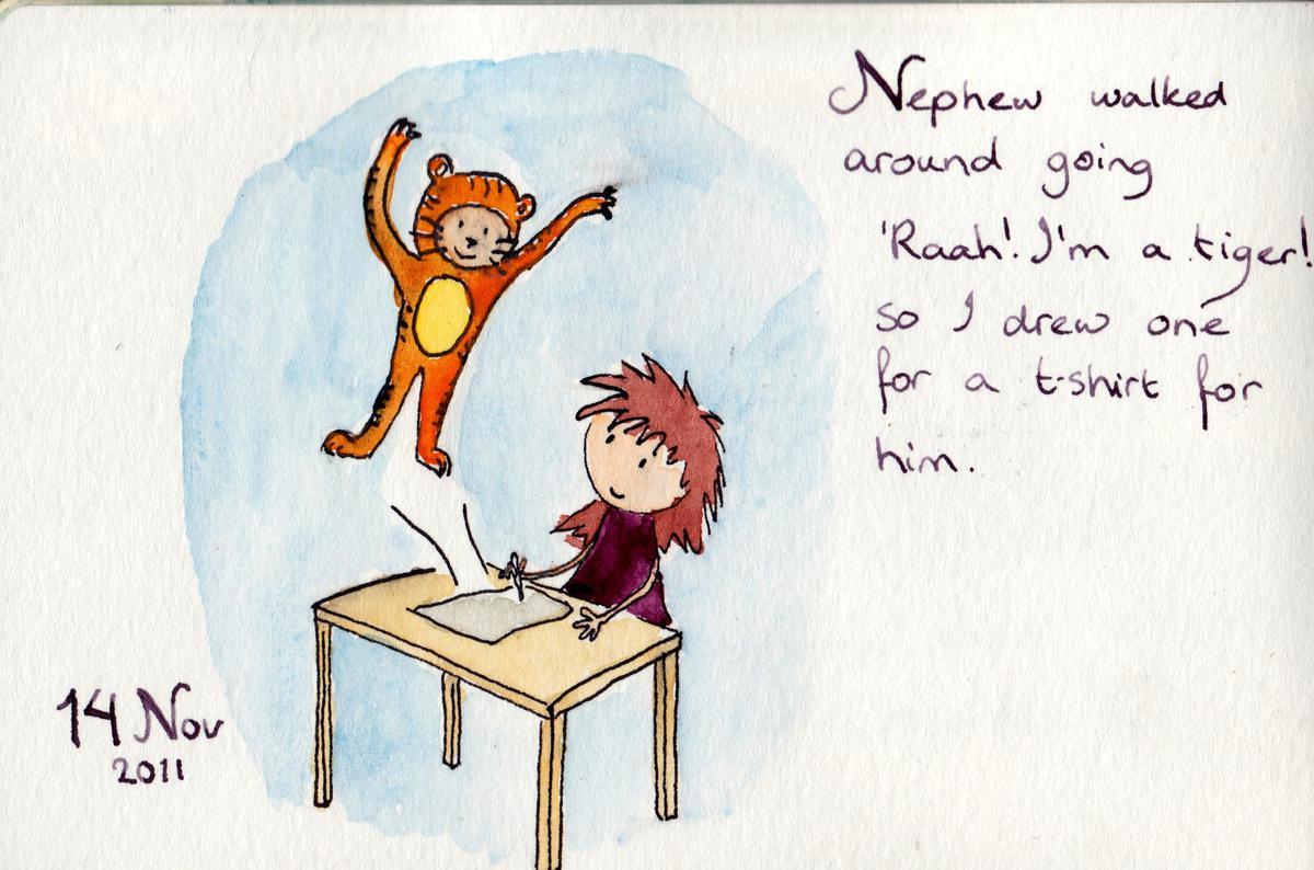 2011.11.14 Date 2011-11-14 12:30 Tags drawing / tiger Comments Nephew walked around going ‘Raah! I’m a tiger!’ so I drew one for a t-shirt for him.