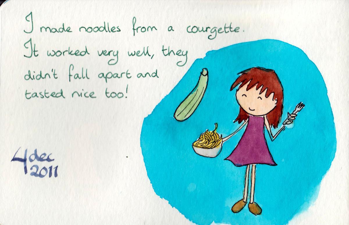 2011.12.04 Date 2011-12-04 14:55 Tags courgette / food / noodles Comments I made noodles from a courgette. It worked very well, they didn’t fall apart and tasted nice too!