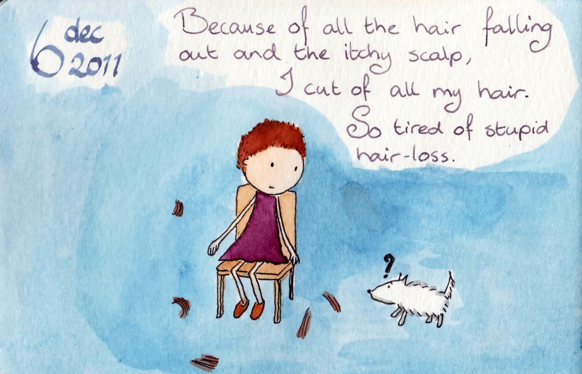 2011.12.06 Date 2011-12-06 10:45 Tags cutting / hair / shave Comments Because of all the hair falling out and the itchy scalp, I cut of all my hair. So tired of stupid hair-loss.