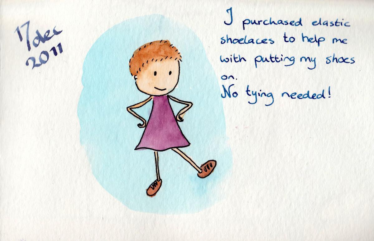 2011.12.17 Date 2011-12-17 01:33 Tags laces / shoes Comments I purchased elastic shoelaces to help me with putting my shoes on. No tying needed!