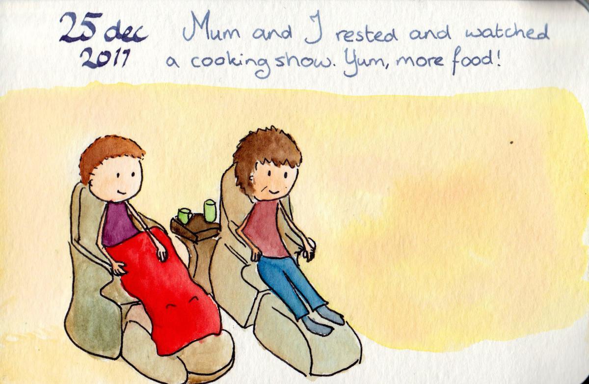 2011.12.25 Date 2011-12-25 05:27 Tags mum / resting / TV Comments Mum and I rested and watched a cookingshow. Yum, more food!