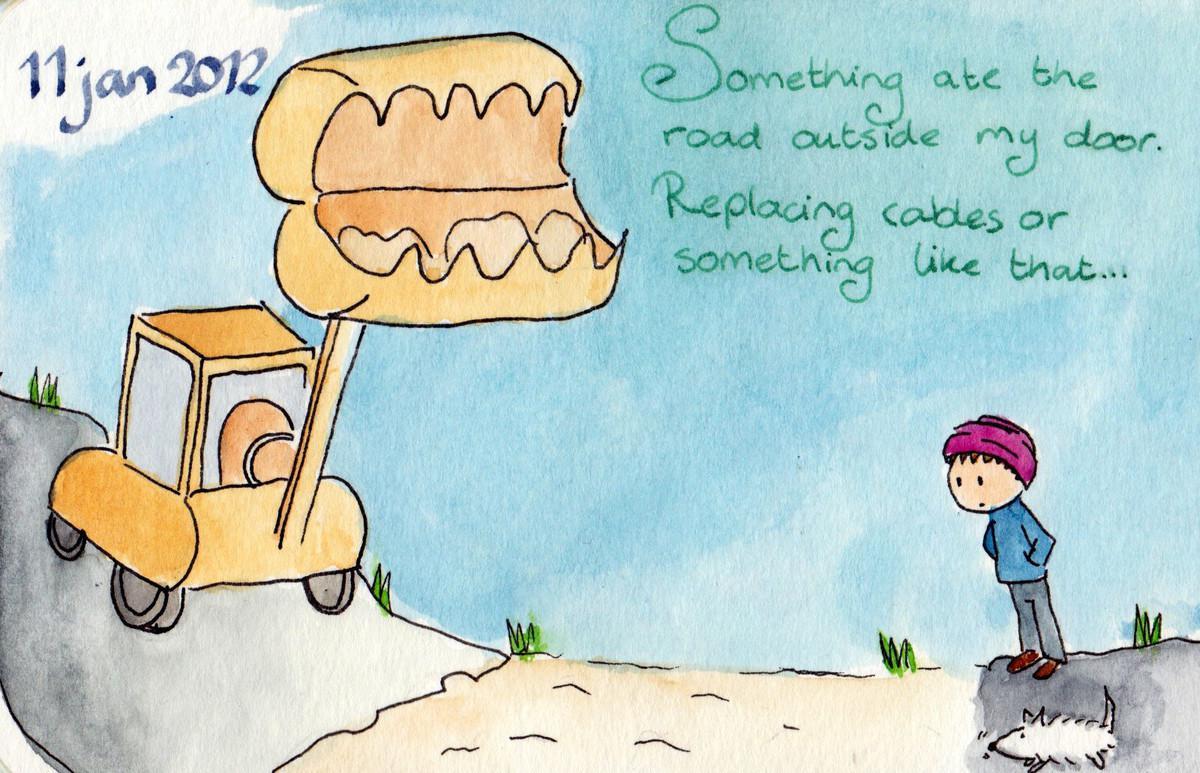 2012.01.11 Date 2012-01-11 21:26 Tags eaten / road Comments Somithng ate the road outside my door. Replacing cables or something like that…