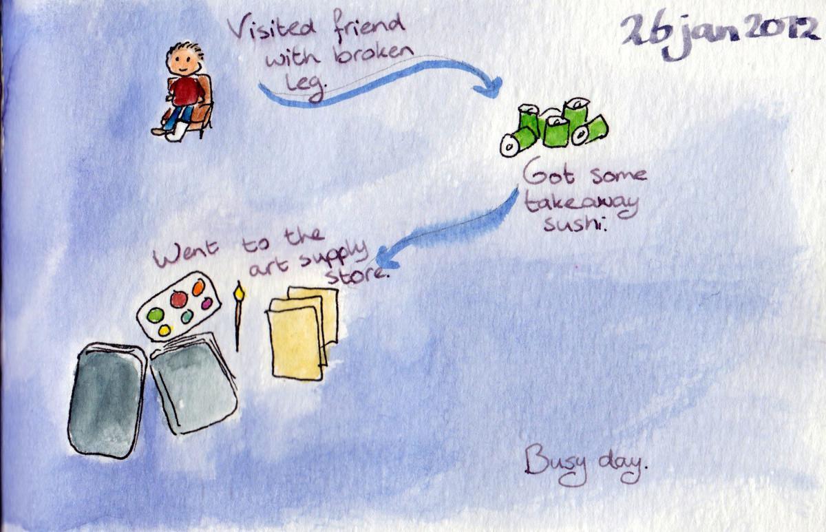 2012.01.26 Date 2012-01-26 20:47 Tags art supplies / sushi Comments Visited friend with broken leg. Got some take-away sushi. Went to the art supply store.