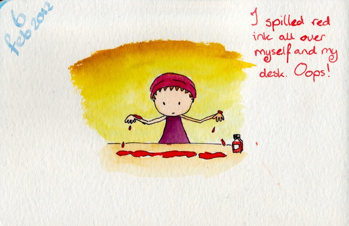 2012.02.06 Date 2012-02-06 00:01 Tags Ink / spilled Comments I spilled red ink all over myself and my desk. Oops!