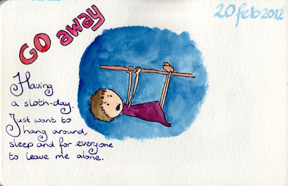 2012.02.20 Date 2012-02-20 00:02 Tags away / sloth / tired Comments GO AWAY Having a sloth-day. Just want to hang around, sleep and for everyone to leave me alone.