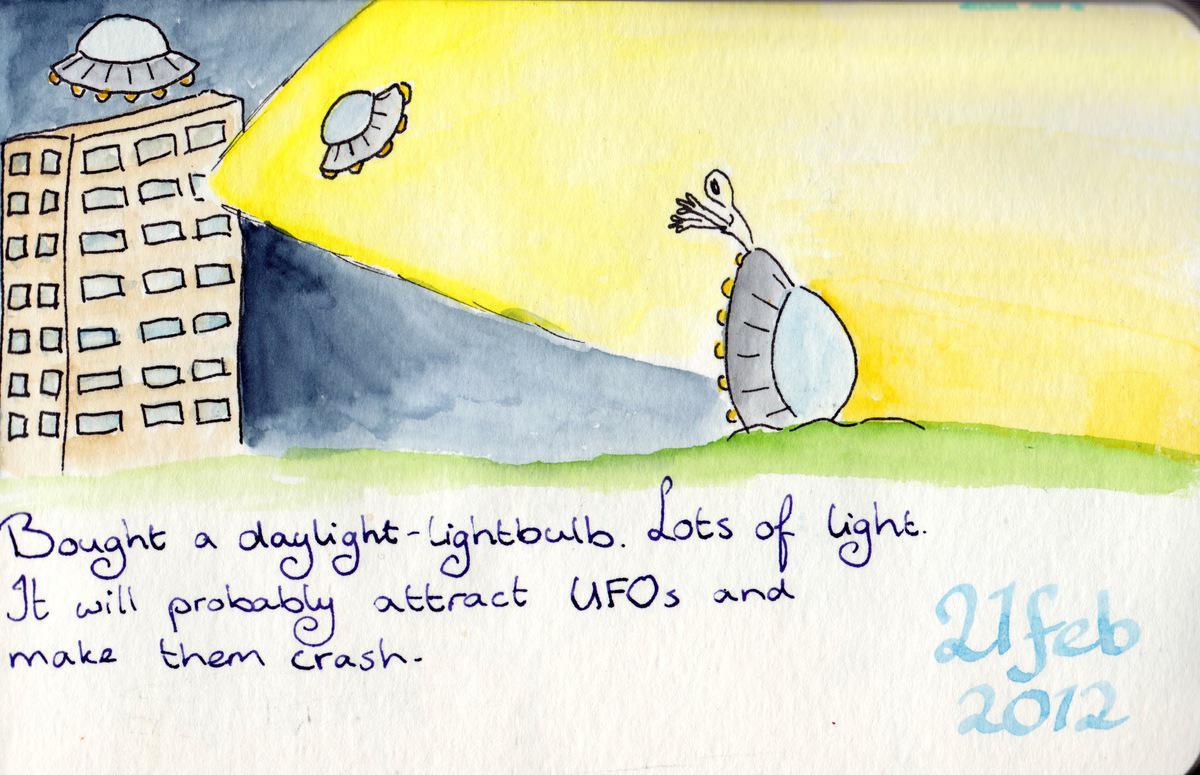 2012.02.21 Date 2012-02-21 00:02 Tags crash / lightbulb / UFO Comments Bought a daylight-lightbulb. Lots of light. It will probably attract UFOs and make them crash.