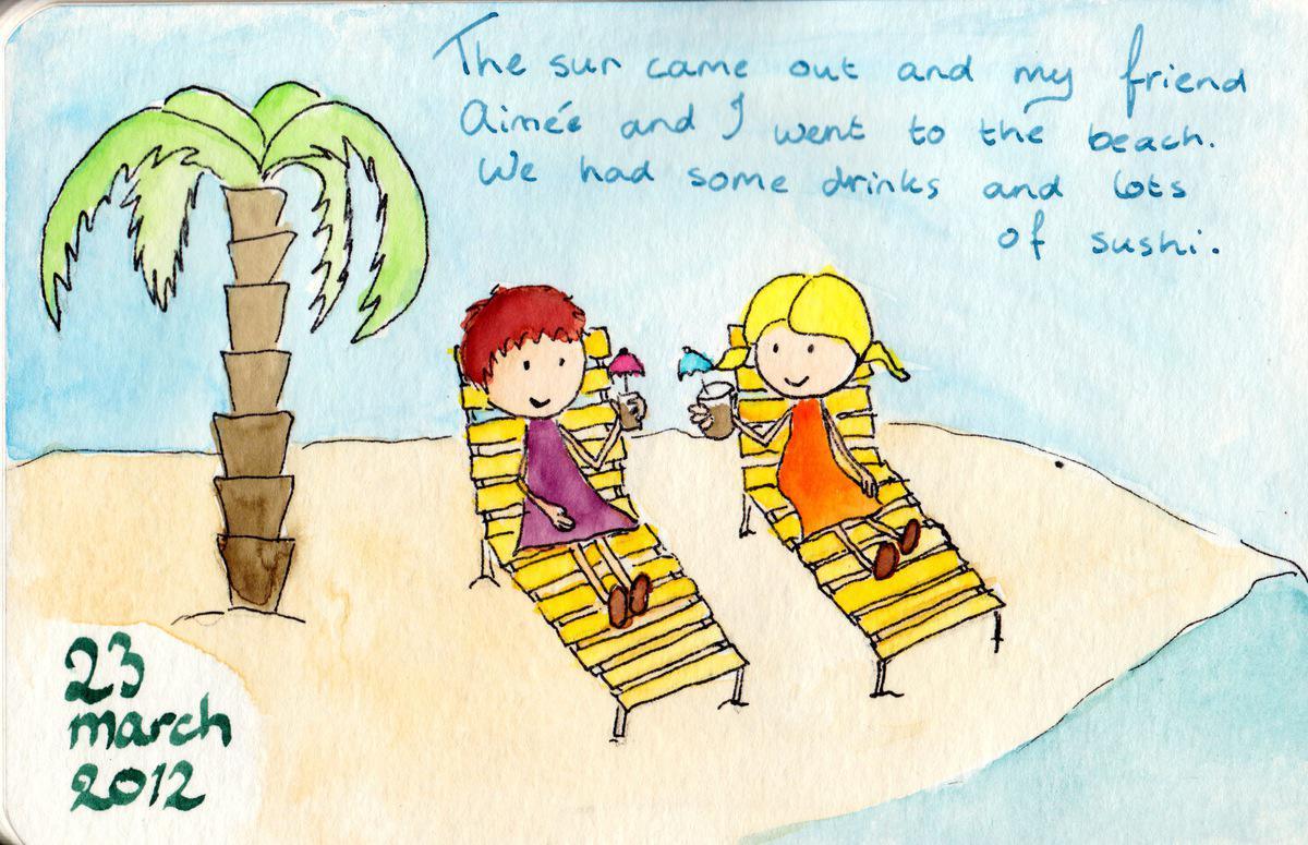 2012.03.23 Date 2012-03-23 00:03 Tags aimee / beach / sunny Comments The sun came out and my friend Aimée and I went to the beach. We had some drinks and lots of sushi.
