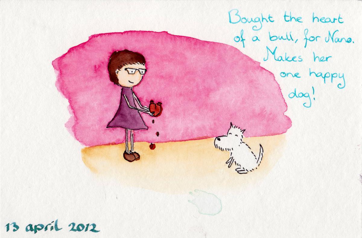 2012.04.13 Date 2012-04-13 16:49 Tags bloody / bull / heart Comments Bought the heart of a bull, for Nano. Makes her one happy dog!