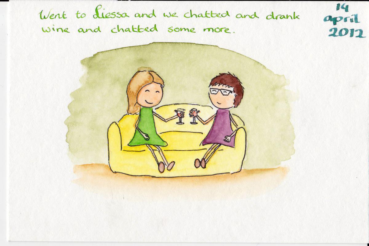 2012.04.14 Date 2012-04-14 16:49 Tags drinks / friends / liessa Comments Went to Liessa and we chatted and drank wine and chatted some more.