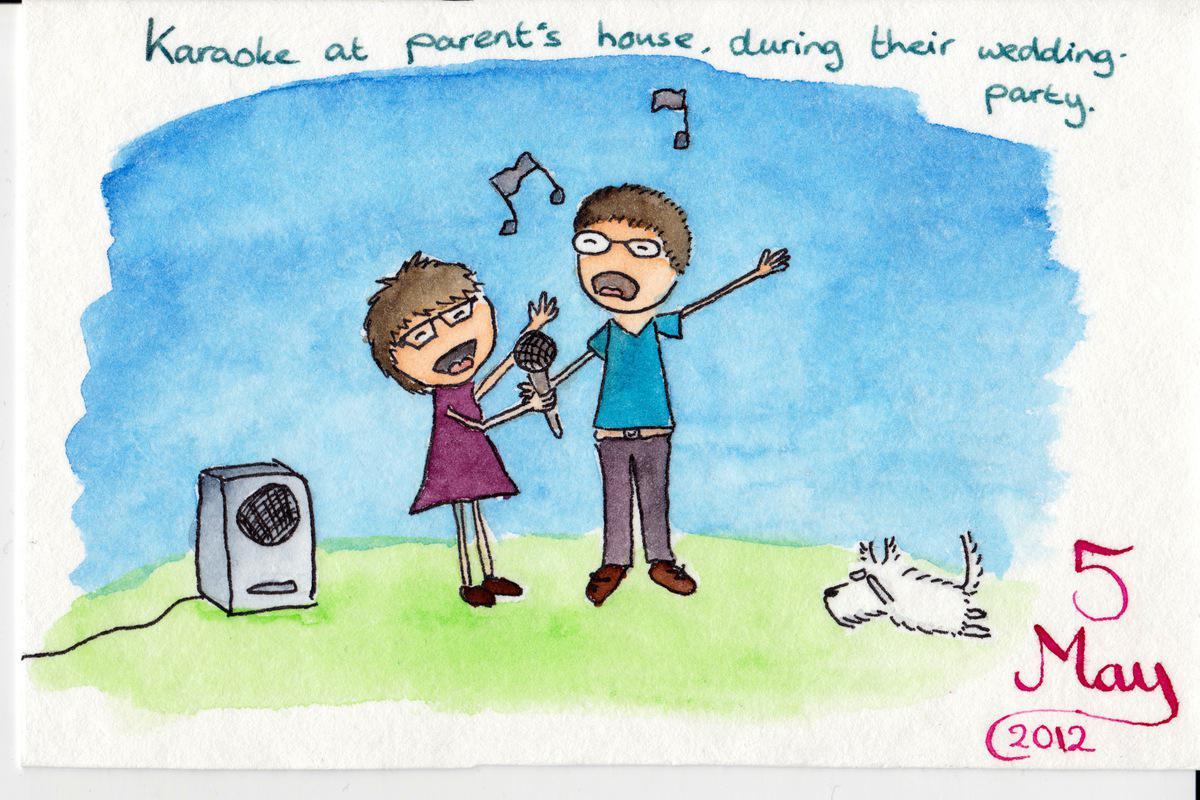 Karaoke at parent’s house, during their wedding party.