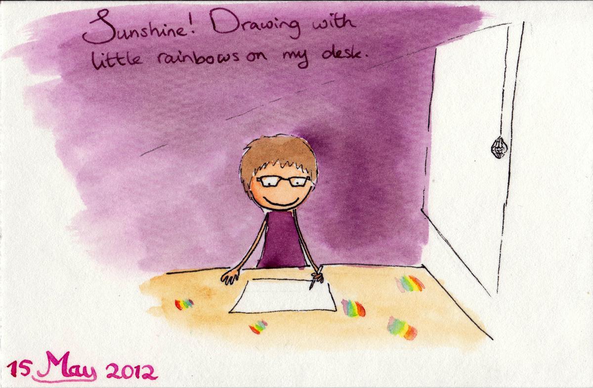 2012.05.15 Date 2012-05-15 18:00 Tags desk / drawing / rainbows Comments Sunshine! Drawing with little rainbows on my desk.