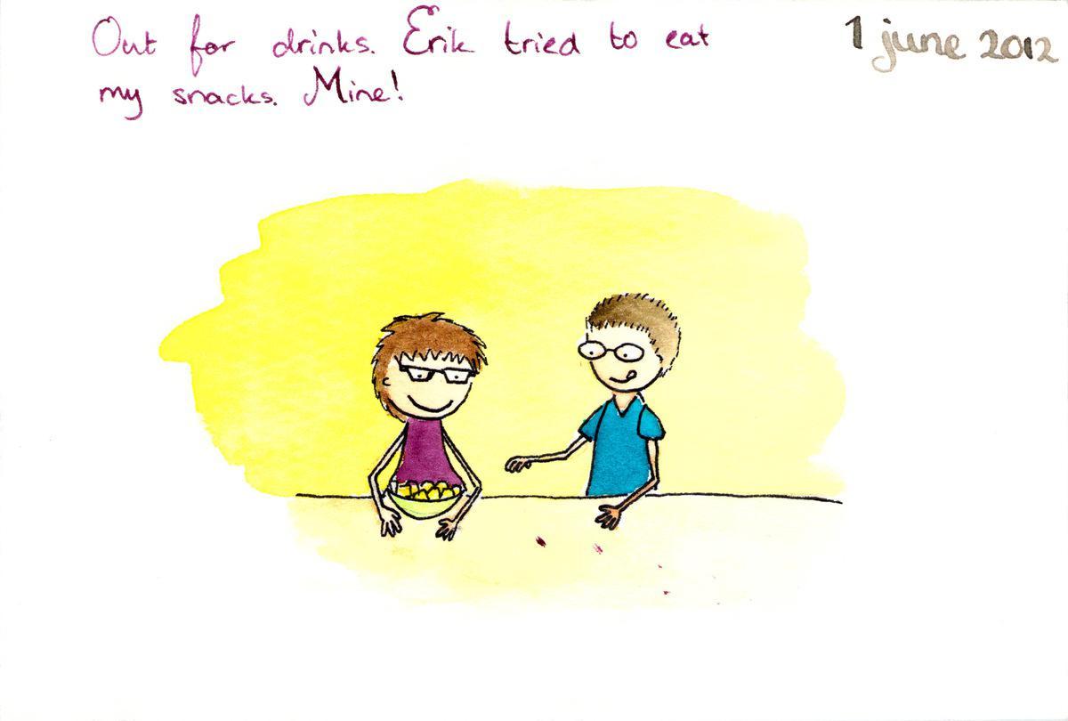 2012.06.01 Date 2012-06-01 18:00 Tags drinks / snacks Comments Out for drinks. Erik tried to eat my snacks. Mine!