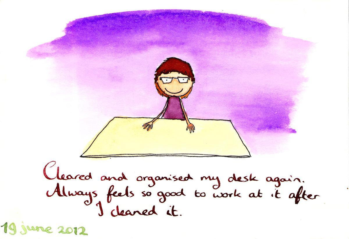 2012.06.19 Date 2013-12-19 18:00 Tags clean / desk Comments Cleared and organised my desk again. Always feels so good to work at it after I cleaned it.
