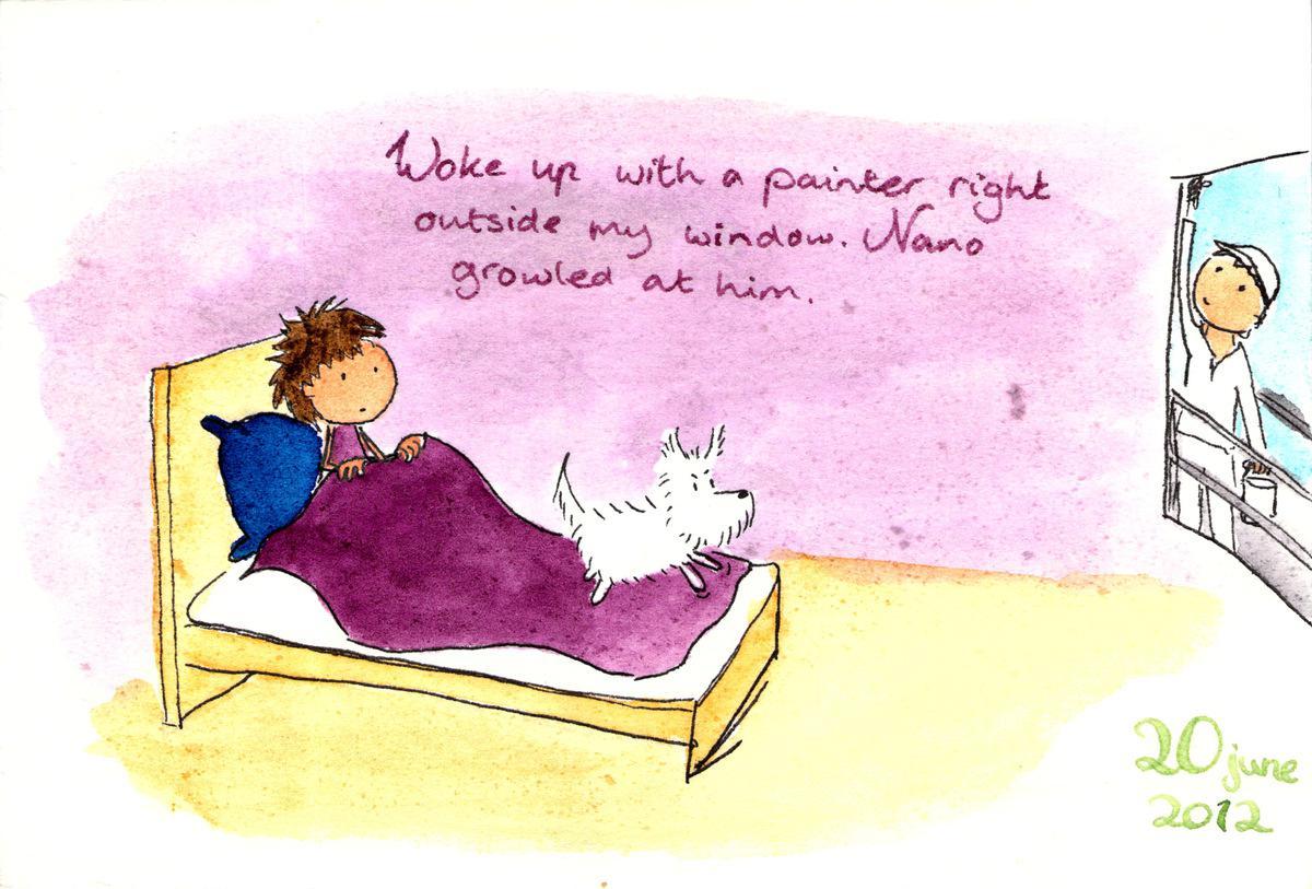 2012.06.20 Date 2013-12-20 15:00 Tags bed / painter / window Comments Woke up with a painter right outside my window. Nano growled at him.
